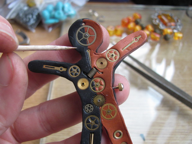 După ce am lipit piesele dorite facem niște găuri cu ajutorul unei scobitori, găuri în care vom prinde zale sau agățători de pandantiv.