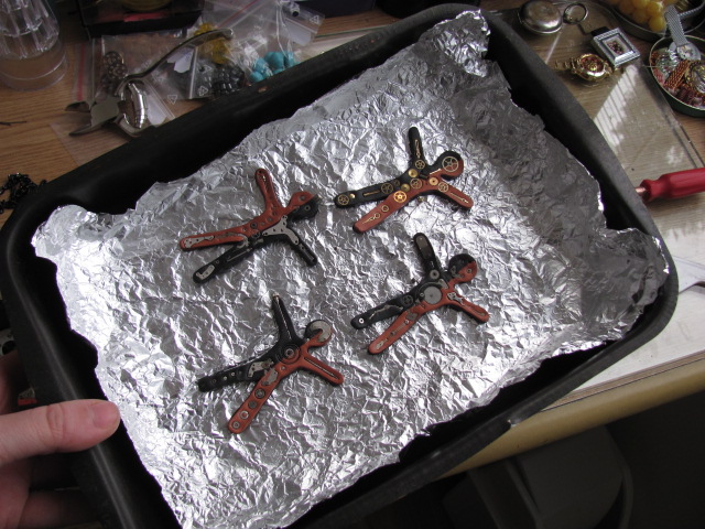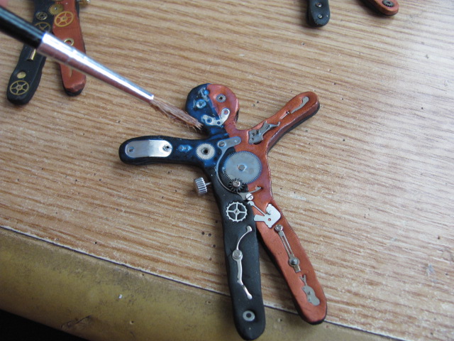 Alegem apoi mini-piesele pe care dorim să le lipim pe omuleți. Eu lipesc de obicei rotițe, șuruburi și diverse tije, toate metalice (nu încercați sa lipiți plastic, piese electronice sau baterii de ceas!). Modelul și cât este de încărcat designul este la alegerea dumneavoastră.