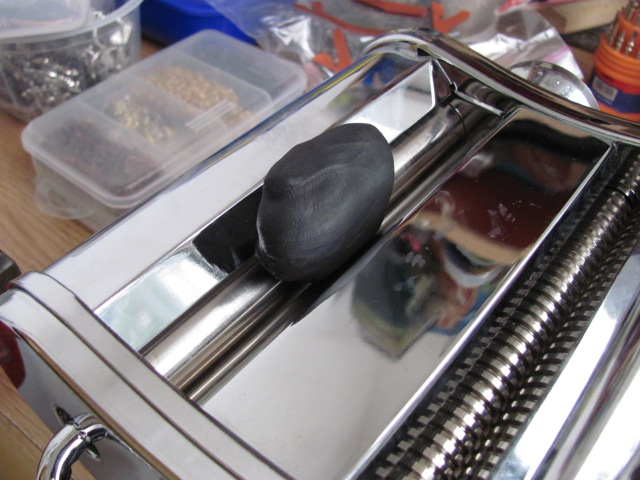 Lucrăm mai întâi cu nuanța de fimo mai deschisă la culoare. O frământăm bine, o trecem prin mașina de paste sau întindem o foaie de maxim 2 mm grosime.