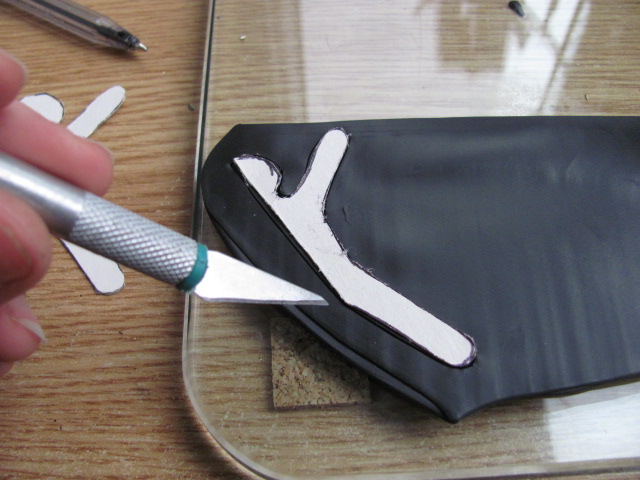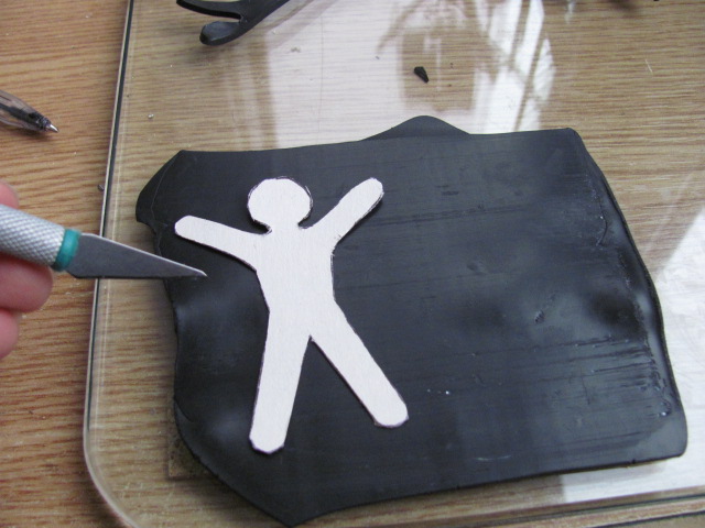 Cu ajutorul unui cutter subțire trasăm jumătatea de siluetă a omulețului (eu am lucrat la patru piese deodată).